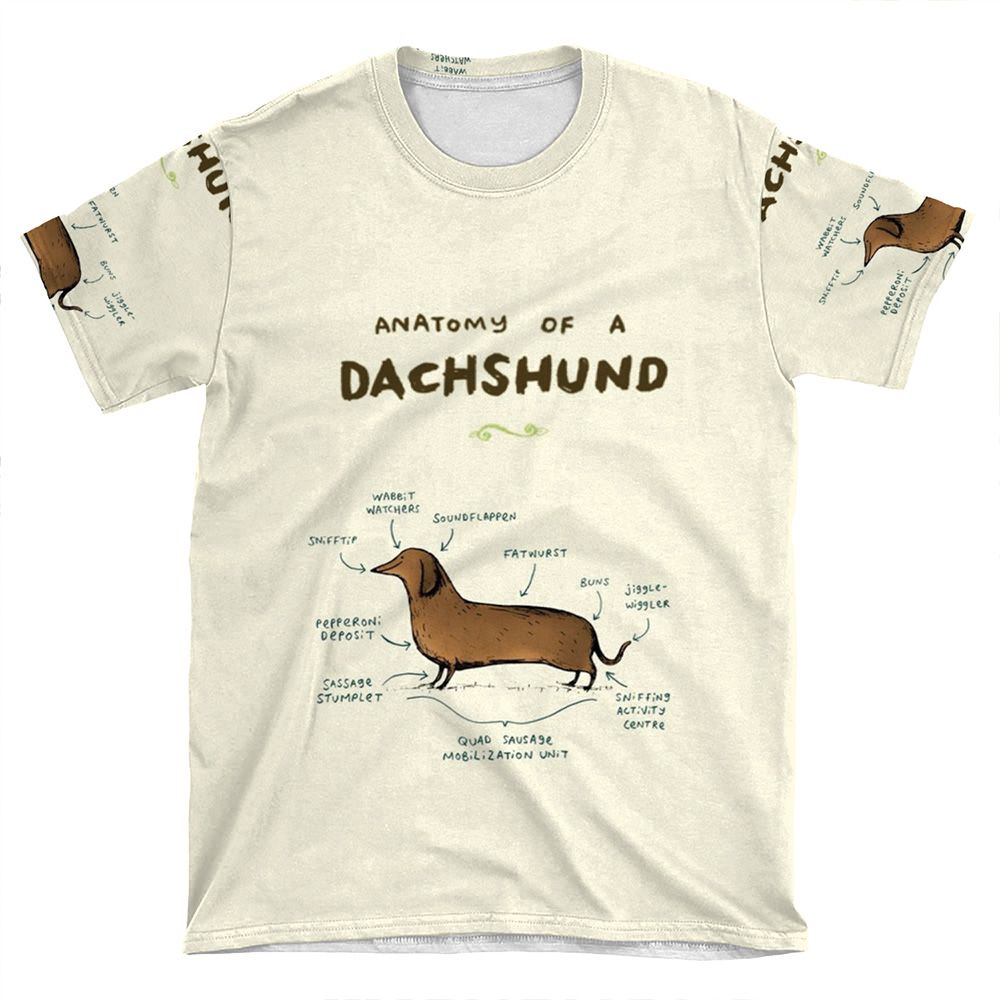 This Anatomy Of A Dachshund AOP T-shirt Tee created to be a versatile and stylish companion for all your casual appearances. With its uniquely textured, thick, microfiber-knit fabric, this t-shirt bears a premium, soft feel that remains lightweight and highly breathable – the perfect combo for a hot day or layering.