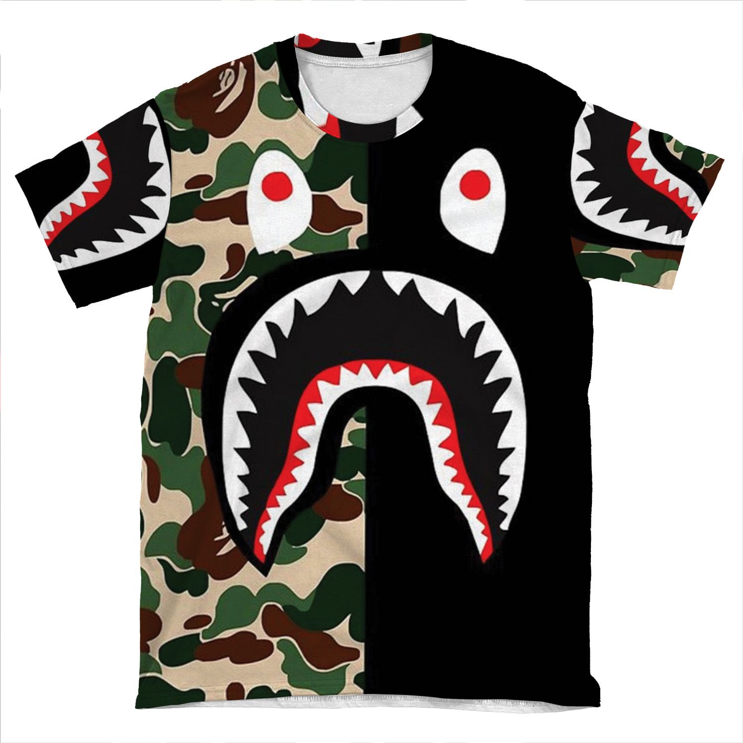 This Black Bape Camo Shark AOP T-shirt Tee created to be a versatile and stylish companion for all your casual appearances. With its uniquely textured, thick, microfiber-knit fabric, this t-shirt bears a premium, soft feel that remains lightweight and highly breathable – the perfect combo for a hot day or layering.
