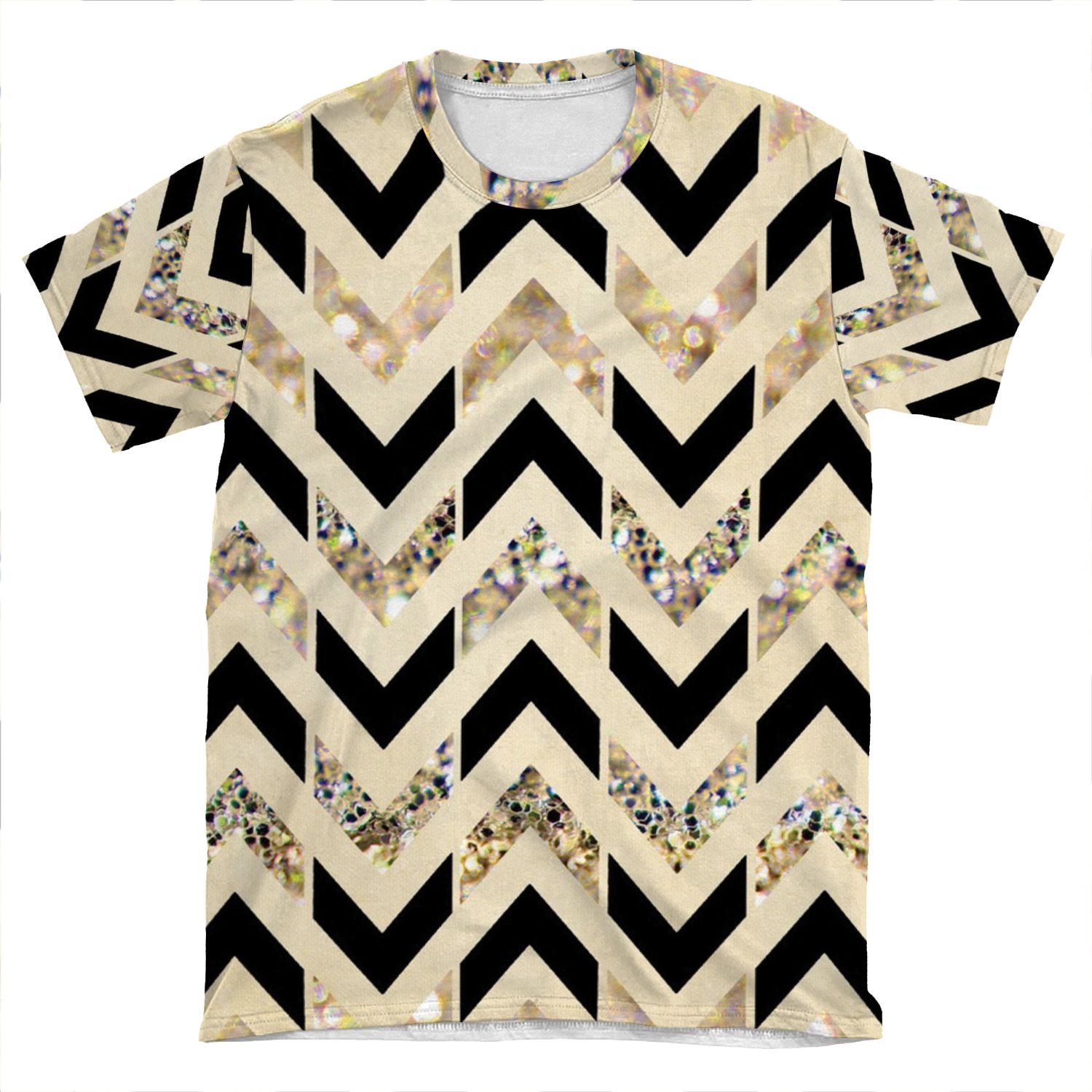 This Black & Gold Glitter Herringbone Chevron On Nude Cream AOP T-shirt Tee created to be a versatile and stylish companion for all your casual appearances. With its uniquely textured, thick, microfiber-knit fabric, this t-shirt bears a premium, soft feel that remains lightweight and highly breathable – the perfect combo for a hot day or layering.