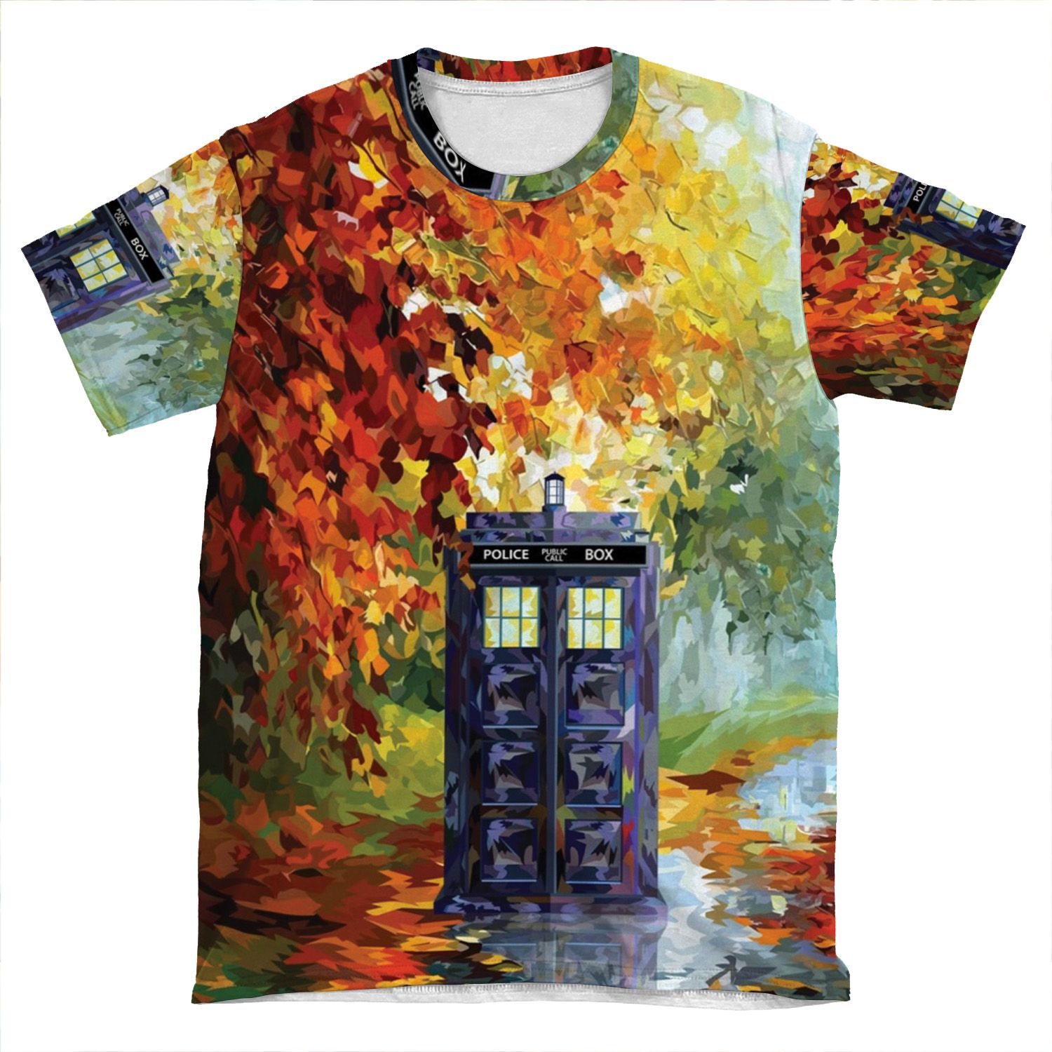 This Blue Phone Booth With Autumn Views AOP T-shirt Tee created to be a versatile and stylish companion for all your casual appearances. With its uniquely textured, thick, microfiber-knit fabric, this t-shirt bears a premium, soft feel that remains lightweight and highly breathable – the perfect combo for a hot day or layering.