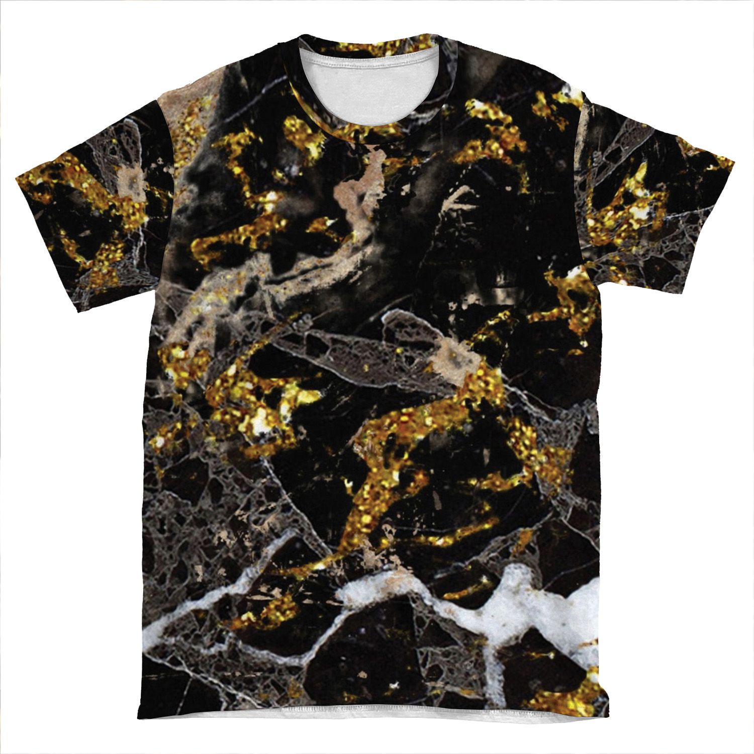 This Dark Marble Stone Pattern With Golden Glitter AOP T-shirt Tee created to be a versatile and stylish companion for all your casual appearances. With its uniquely textured, thick, microfiber-knit fabric, this t-shirt bears a premium, soft feel that remains lightweight and highly breathable – the perfect combo for a hot day or layering.