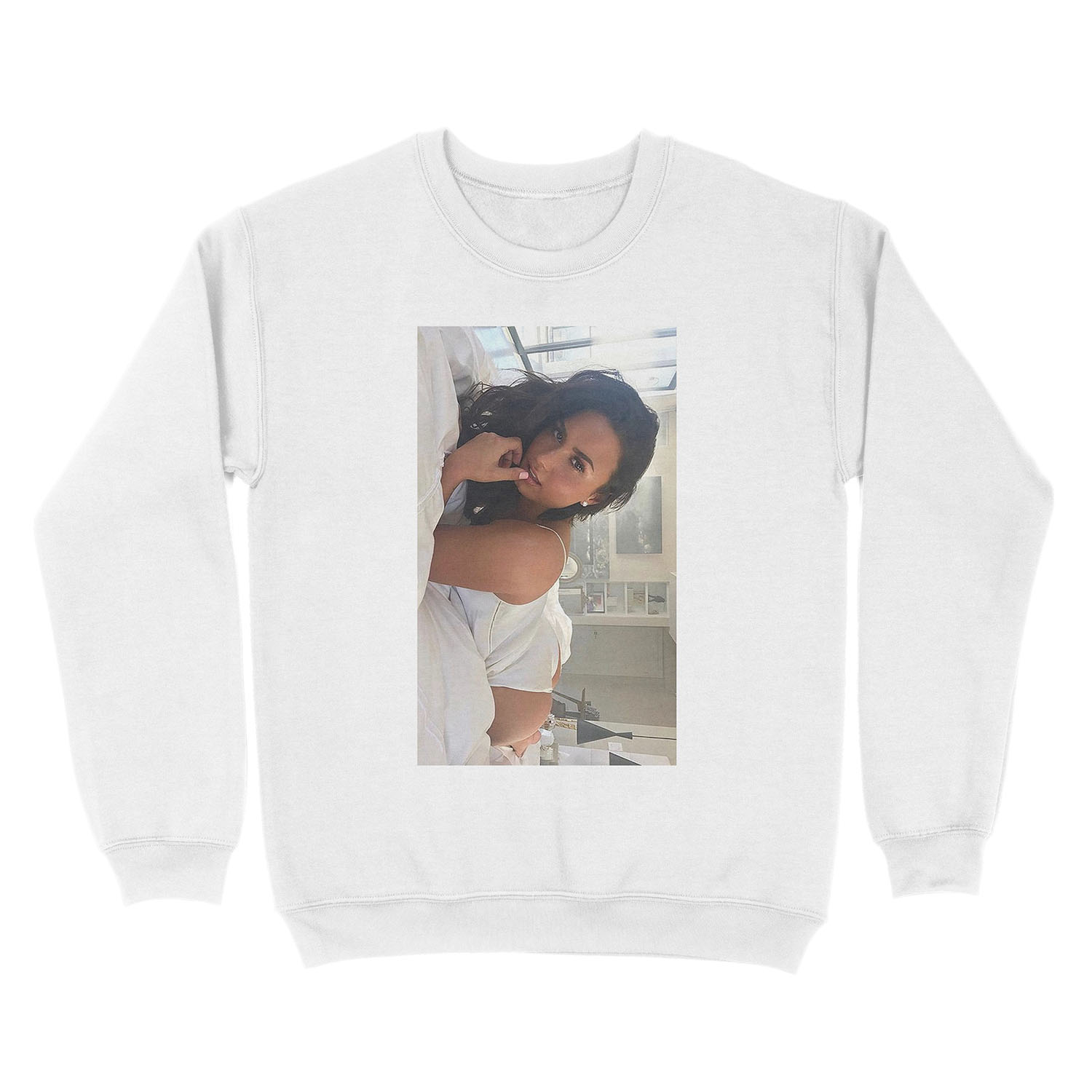 Material of Demi Lovato laying in bed Unisex Crewneck Sweatshirt