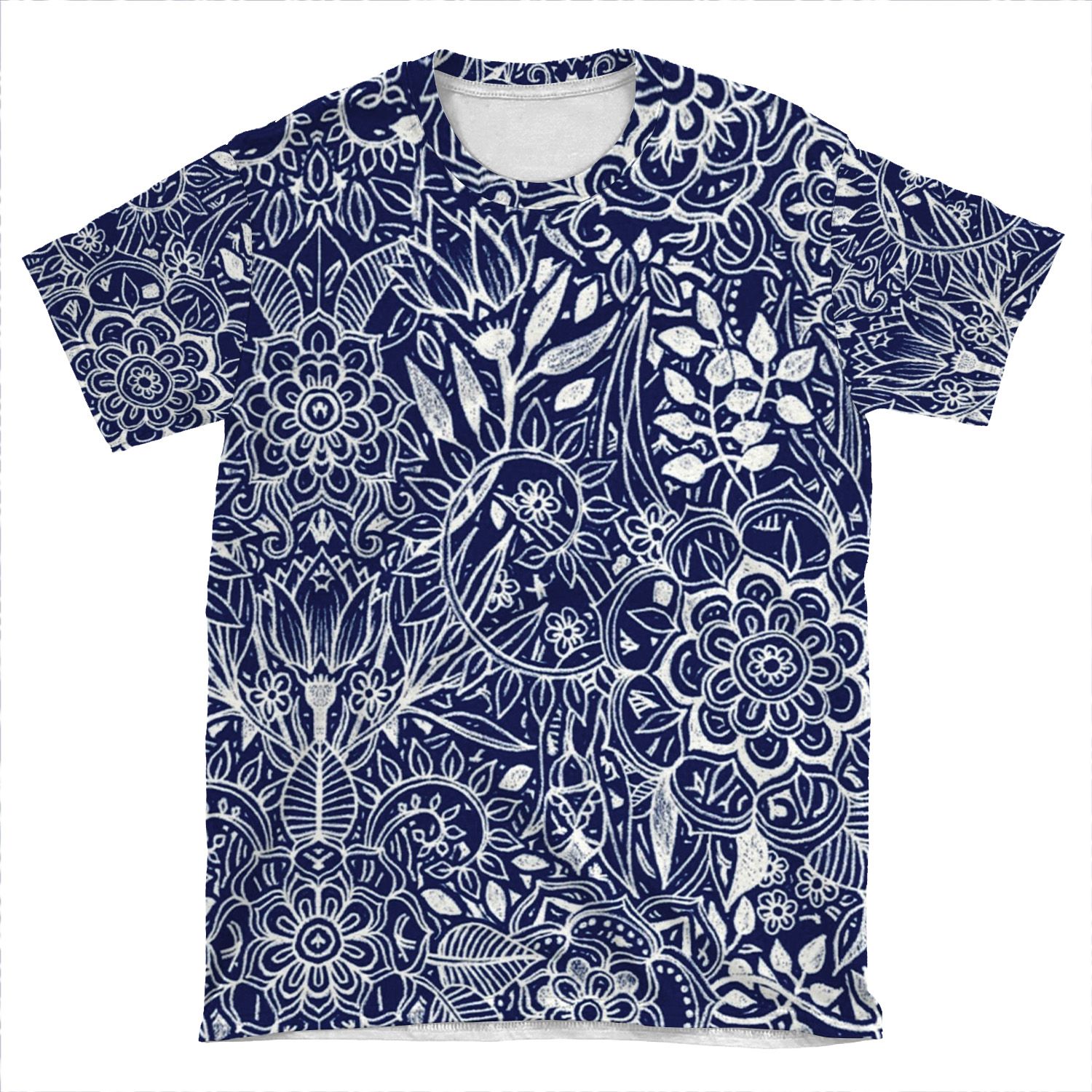 Detailed Floral Pattern In White On Navy AOP T-shirt Tee