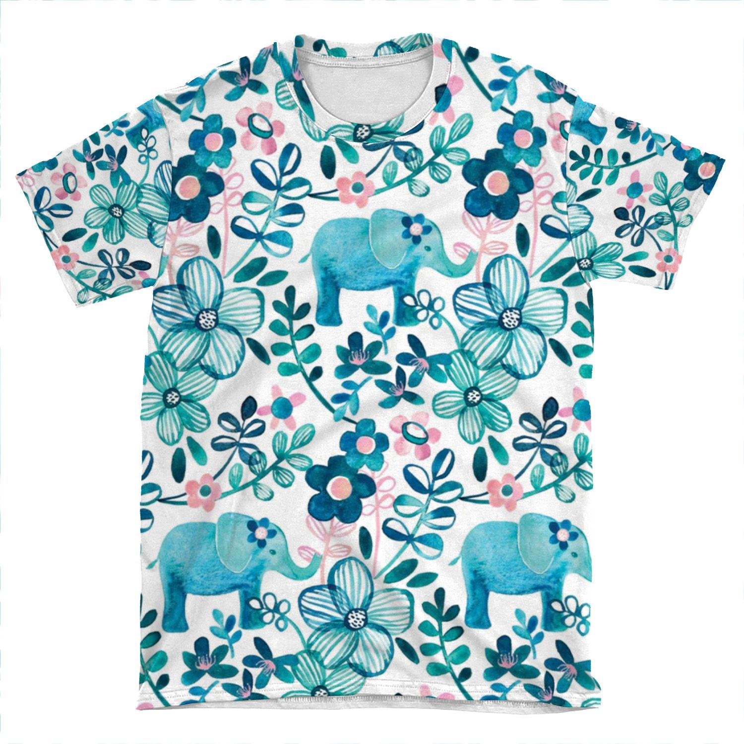 This Dusty Pink, White And Teal Elephant And Floral Watercolor Pattern AOP T-shirt Tee created to be a versatile and stylish companion for all your casual appearances. With its uniquely textured, thick, microfiber-knit fabric, this t-shirt bears a premium, soft feel that remains lightweight and highly breathable – the perfect combo for a hot day or layering.
