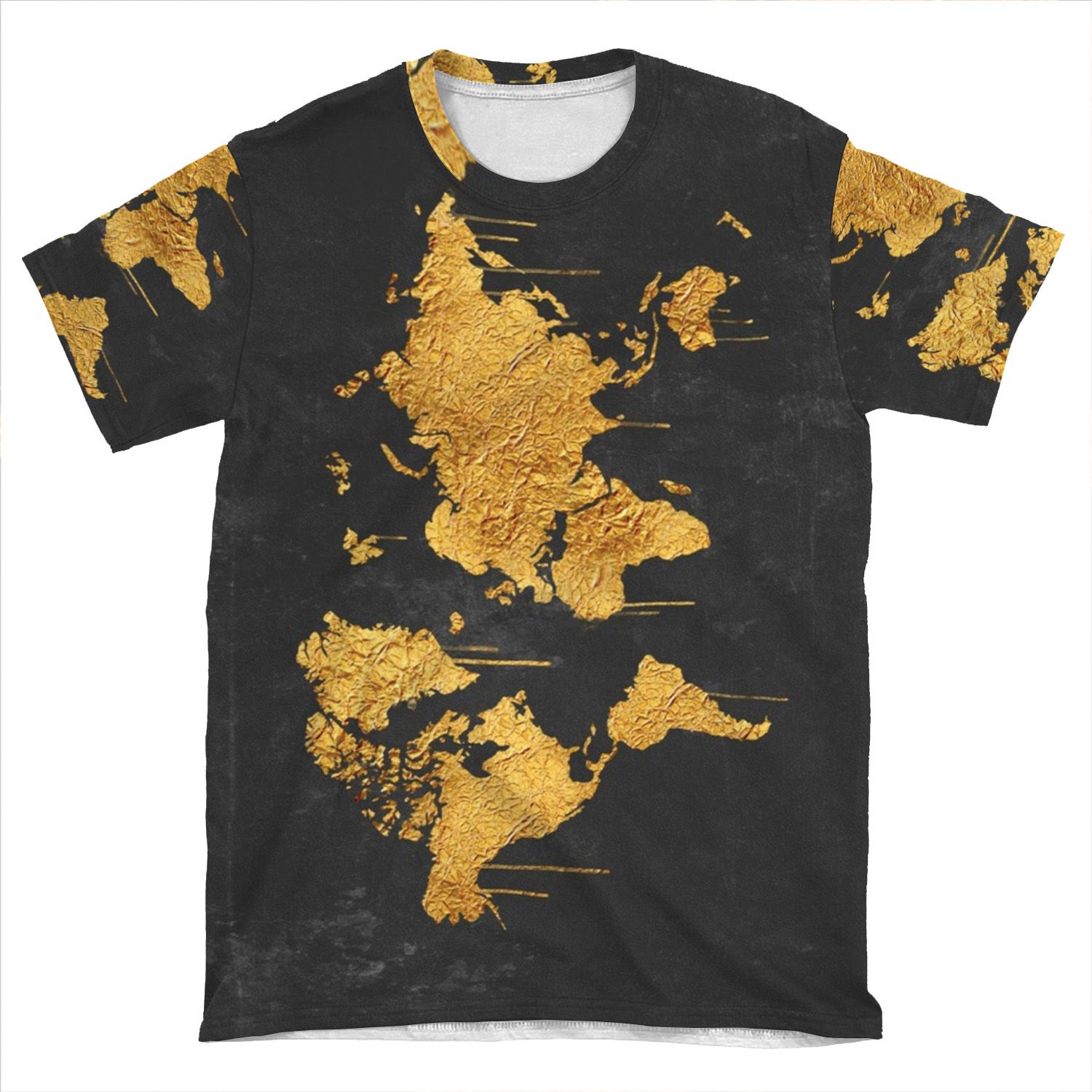 This Gold World Map AOP T-shirt Tee created to be a versatile and stylish companion for all your casual appearances. With its uniquely textured, thick, microfiber-knit fabric, this t-shirt bears a premium, soft feel that remains lightweight and highly breathable – the perfect combo for a hot day or layering.