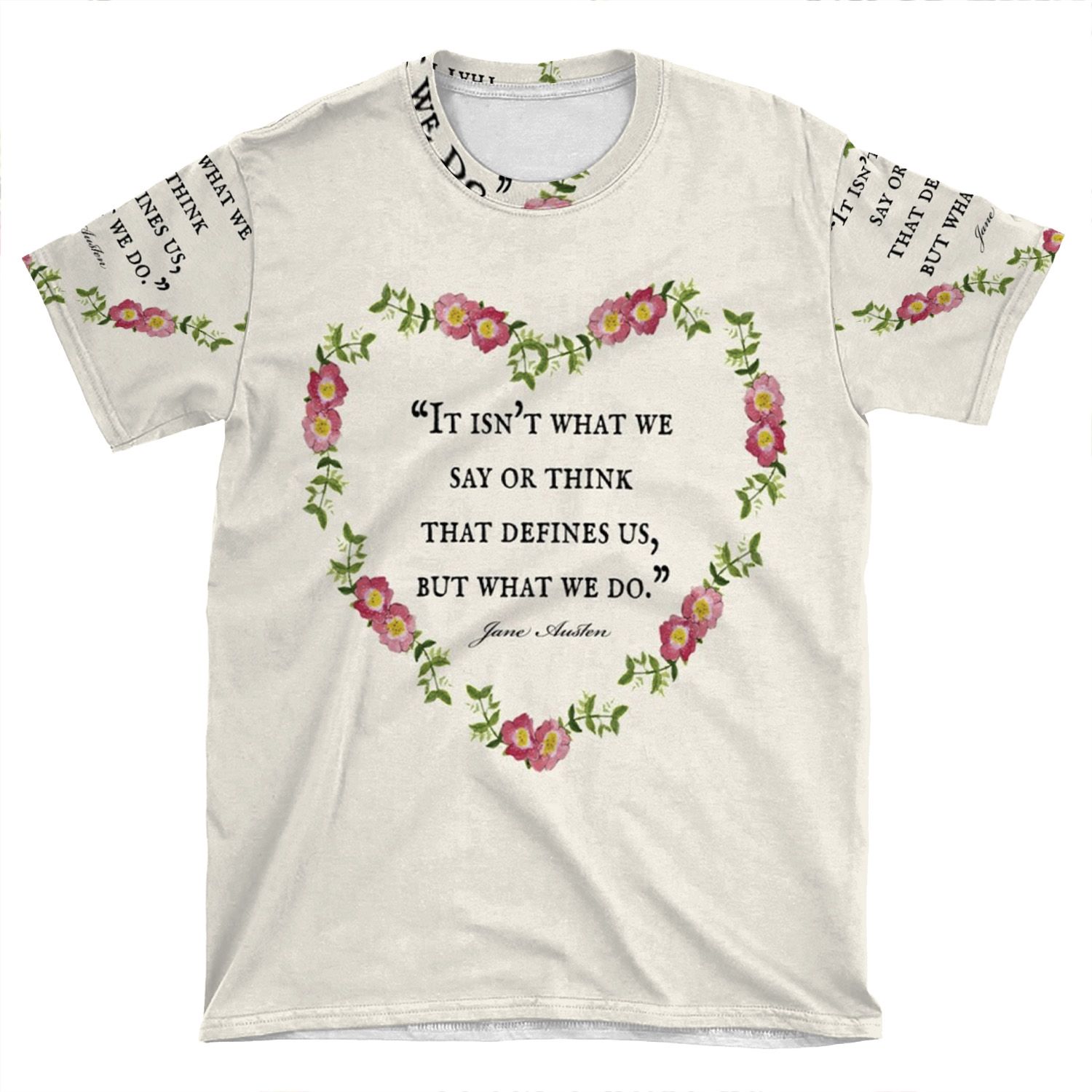 This Jane Austen Floral ‘Defines Us’ Quote AOP T-shirt Tee created to be a versatile and stylish companion for all your casual appearances. With its uniquely textured, thick, microfiber-knit fabric, this t-shirt bears a premium, soft feel that remains lightweight and highly breathable – the perfect combo for a hot day or layering.