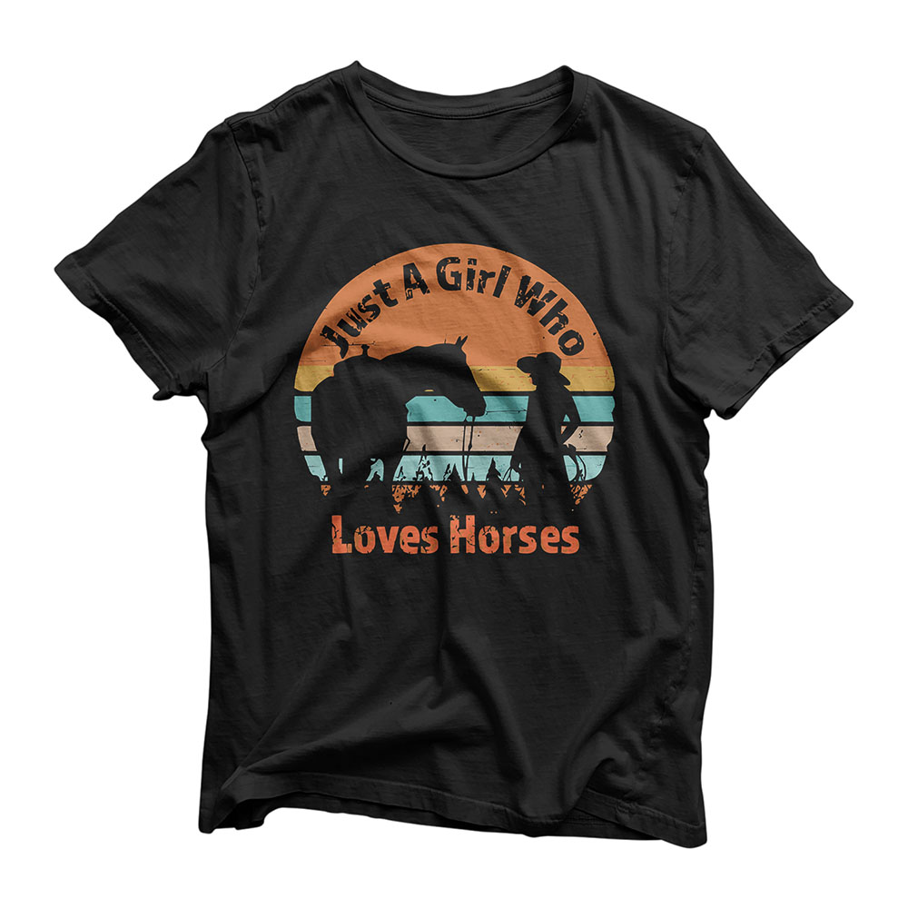 Material of Just A Girl Who Loves Her Horse Retro Sunset Silhouette Gift T-Shirt