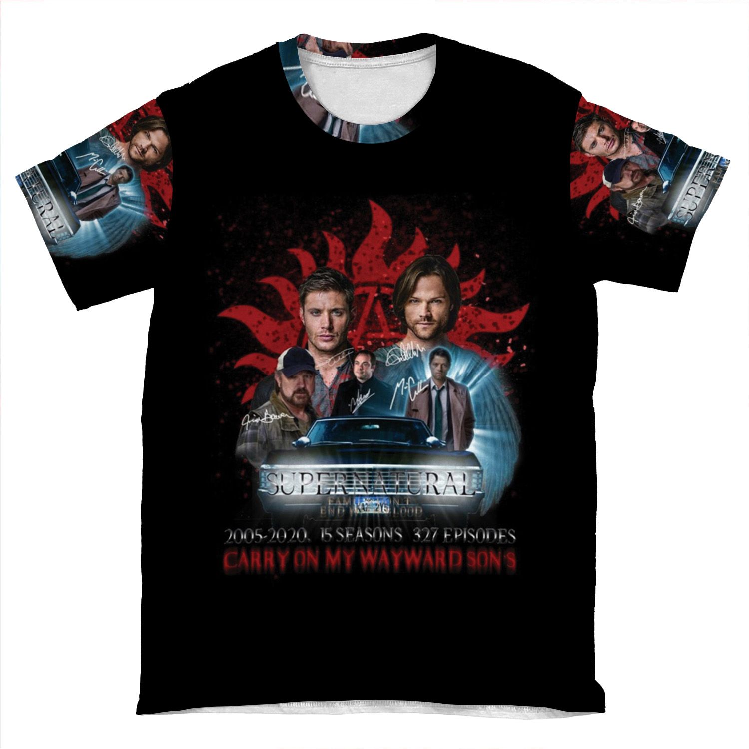 This Limited Edition Supernatural Family Dont End With Blood 4R Signed AOP T-shirt Tee created to be a versatile and stylish companion for all your casual appearances. With its uniquely textured, thick, microfiber-knit fabric, this t-shirt bears a premium, soft feel that remains lightweight and highly breathable – the perfect combo for a hot day or layering.
