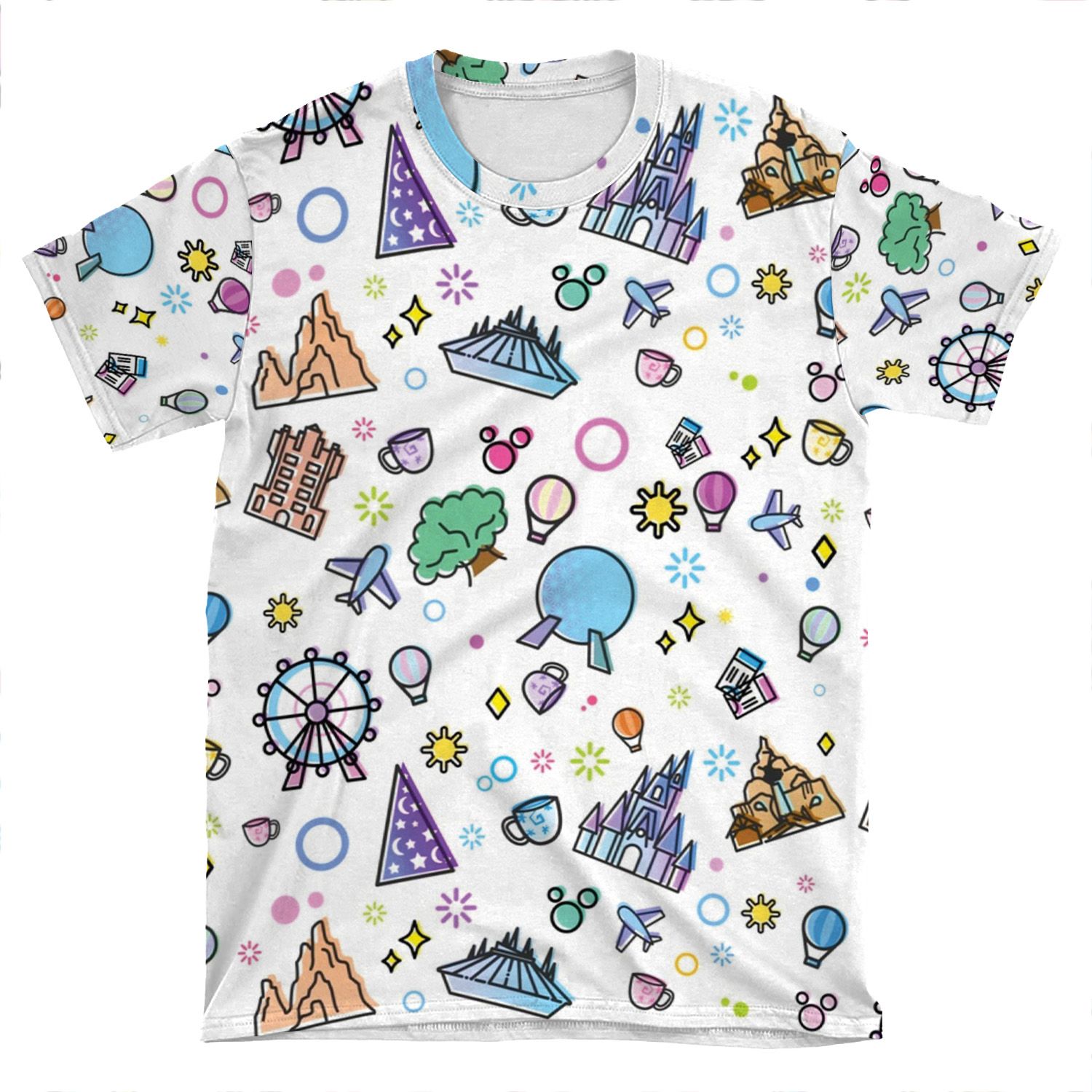 This Meet Me At My Happy Place Pattern. Happiest Place On Earth. Florida Orlando Icons. Ferris Wheel Theme Park. AOP T-shirt Tee created to be a versatile and stylish companion for all your casual appearances. With its uniquely textured, thick, microfiber-knit fabric, this t-shirt bears a premium, soft feel that remains lightweight and highly breathable – the perfect combo for a hot day or layering.