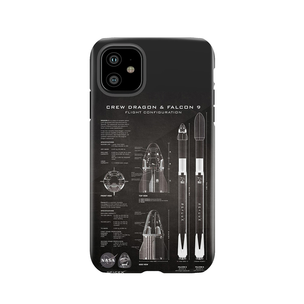 This Nasa Spacex Crew Dragon Spacecraft & Falcon 9 Rocket Blueprint In High Resolution (Black) Tough Phone Case fits snugly over the curves of your Phone, protecting it from harm without adding bulk.