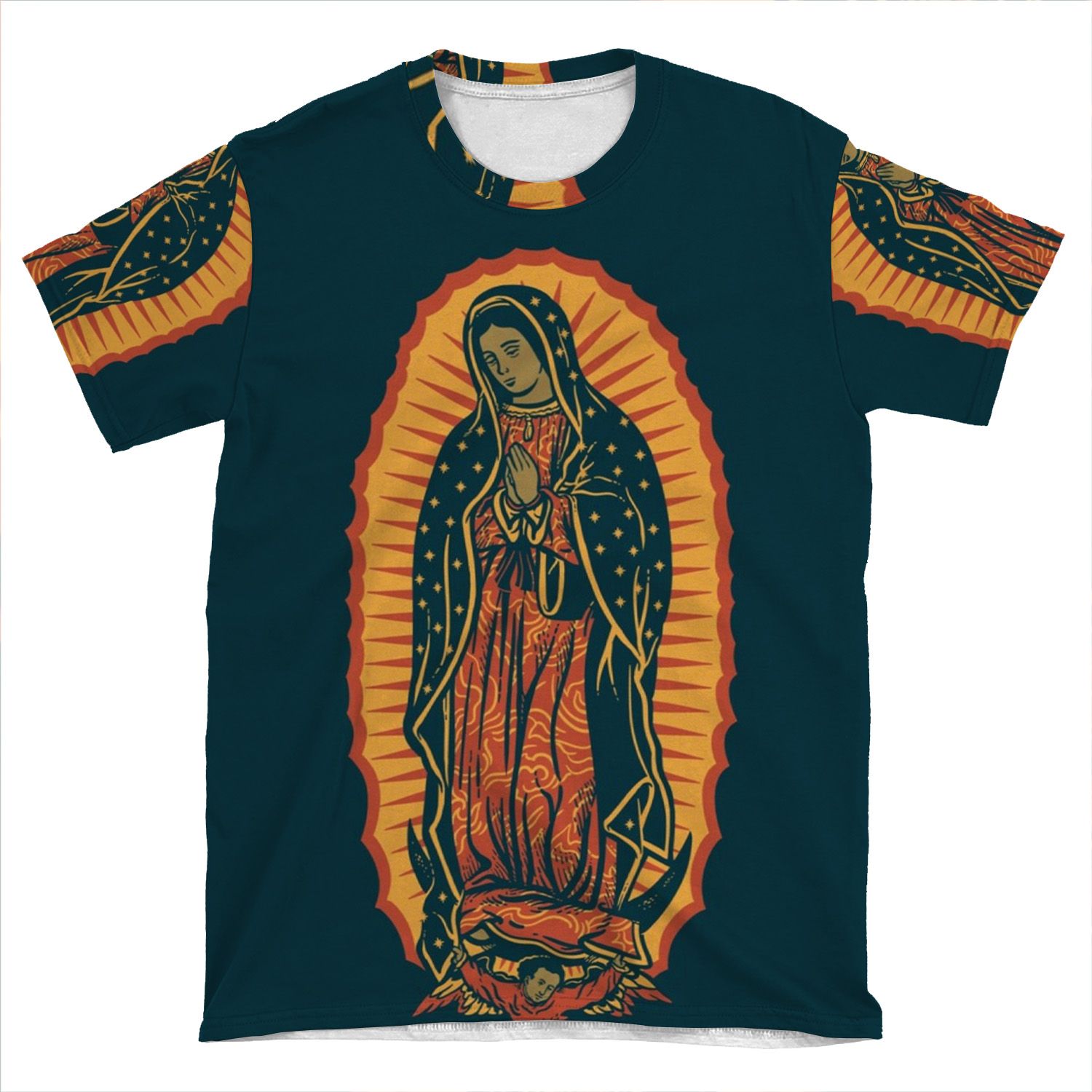 This Our Lady Of Guadalupe I-Phone AOP T-shirt Tee created to be a versatile and stylish companion for all your casual appearances. With its uniquely textured, thick, microfiber-knit fabric, this t-shirt bears a premium, soft feel that remains lightweight and highly breathable – the perfect combo for a hot day or layering.