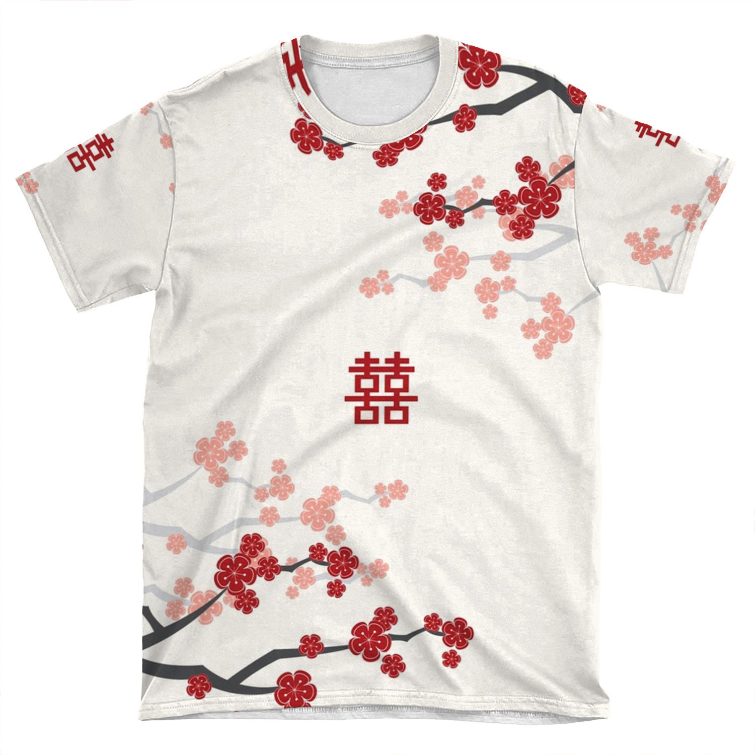 Red Oriental Cherry Blossoms On Ivory And Chinese Wedding Double Happiness | Japanese Sakura AOP T-shirt Tee