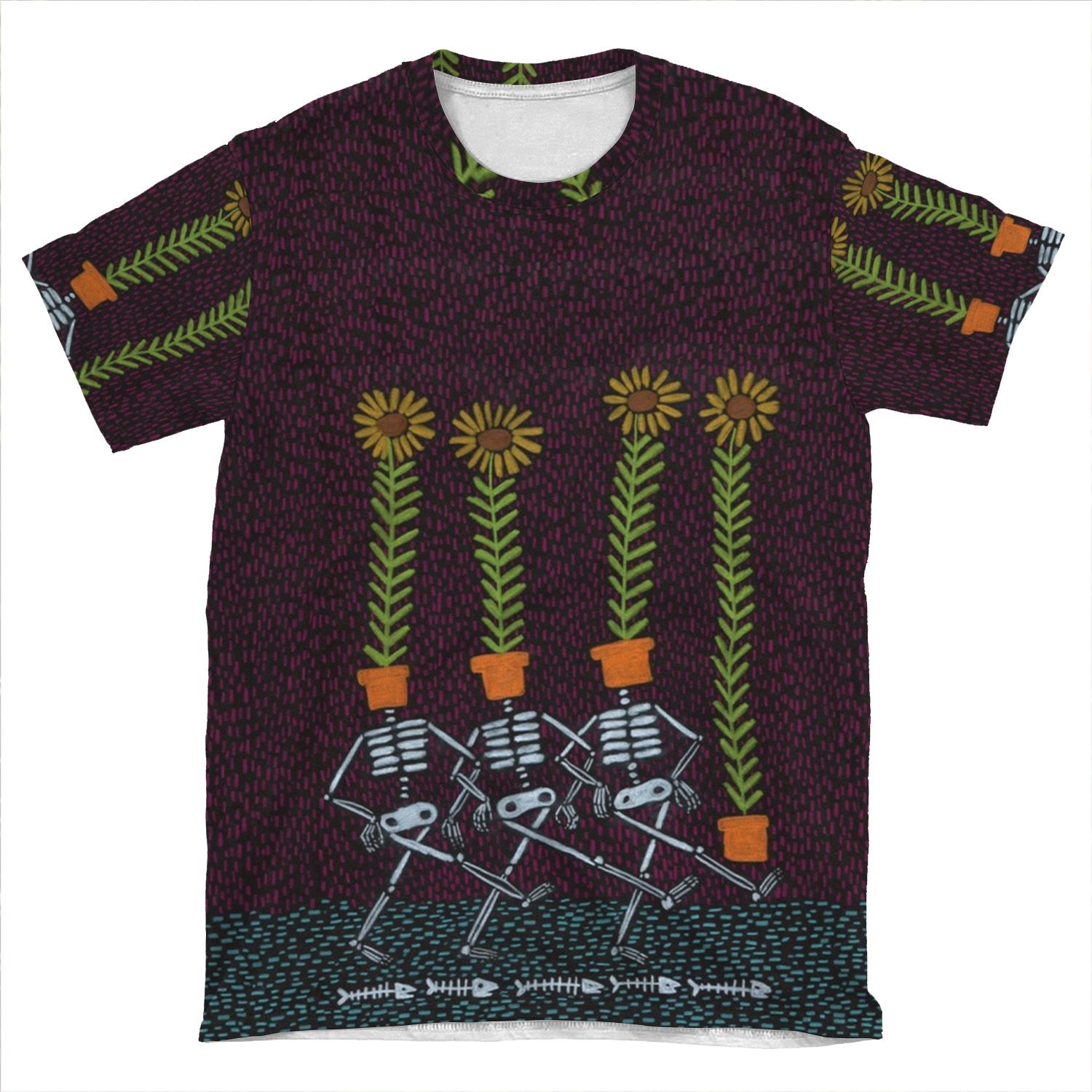 This Sunflower Skeletons AOP T-shirt Tee created to be a versatile and stylish companion for all your casual appearances. With its uniquely textured, thick, microfiber-knit fabric, this t-shirt bears a premium, soft feel that remains lightweight and highly breathable – the perfect combo for a hot day or layering.