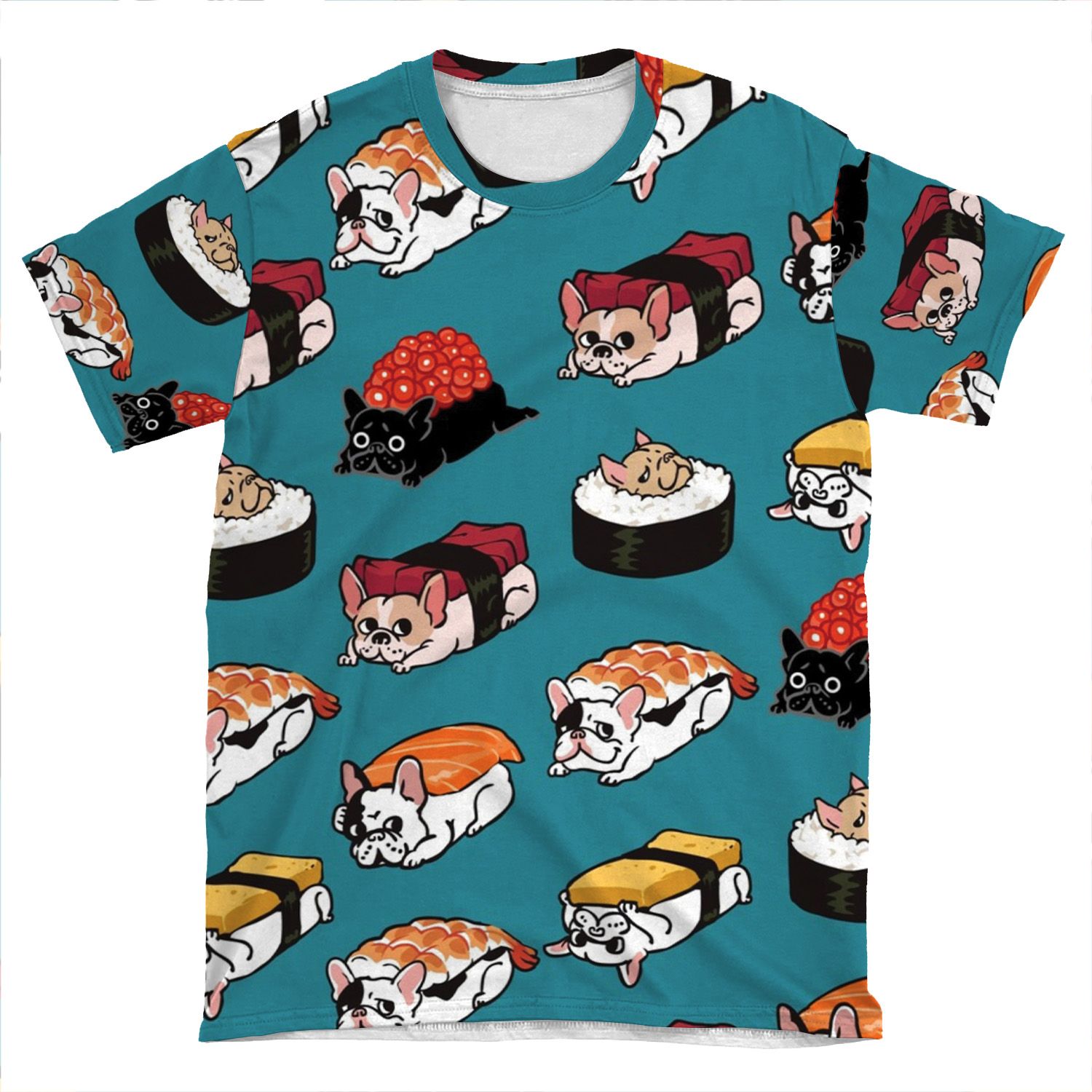 This Sushi Frenchie AOP T-shirt Tee created to be a versatile and stylish companion for all your casual appearances. With its uniquely textured, thick, microfiber-knit fabric, this t-shirt bears a premium, soft feel that remains lightweight and highly breathable – the perfect combo for a hot day or layering.