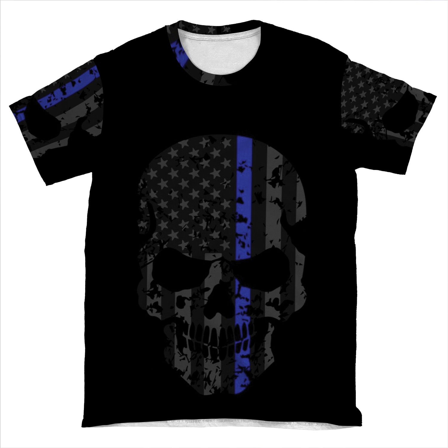This Thin Blue Line Police American Flag Distressed Skull AOP T-shirt Tee created to be a versatile and stylish companion for all your casual appearances. With its uniquely textured, thick, microfiber-knit fabric, this t-shirt bears a premium, soft feel that remains lightweight and highly breathable – the perfect combo for a hot day or layering.