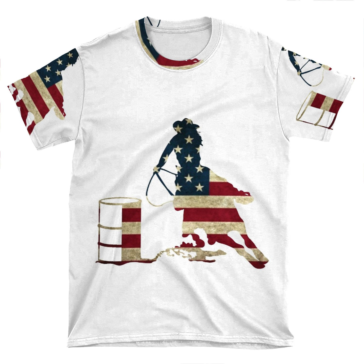 This Usa Barrel Racing AOP T-shirt Tee created to be a versatile and stylish companion for all your casual appearances. With its uniquely textured, thick, microfiber-knit fabric, this t-shirt bears a premium, soft feel that remains lightweight and highly breathable – the perfect combo for a hot day or layering.